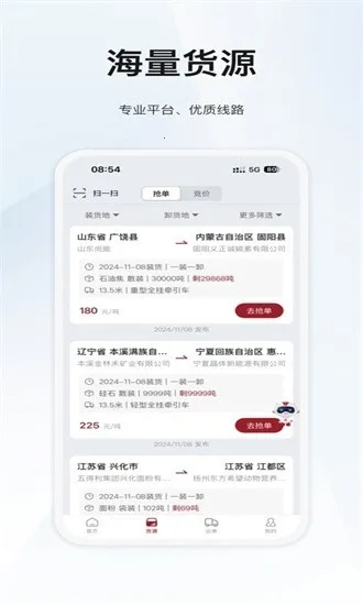 1. 海量货源:每日千万级货源信息实时更新,操作简单便捷,有效降低空驶率,提升运输收益。