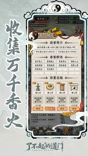 想体验独特的道门经营养成吗?《了不起的道门》就能满足你!在这里,你将扮演落魄道观观主,从零开始复兴宗门。通过求道台用摸骨术招募弟子,高资质弟子自动修炼,轻松提升宗门实力。经营道观时,建设建筑吸引信徒,在坊市买卖法器积累财富资源。特色玩法超丰富,香火殿求签问卦感受国风文化,炼制道器提升战力,还能带领弟子下山除魔抓鬼解锁成就。而且游戏护肝,离线也能自动积累资源提升弟子实力。其画面是细腻的国风水墨画风,还有悠扬音效,让你沉浸在仙侠世界。社交方面能与其他玩家交流切磋,分享心得。无论你是新手还是老玩家,都能在这找到属于自己的修炼与经营乐趣,快来开启了不起 的道门境界之旅吧!