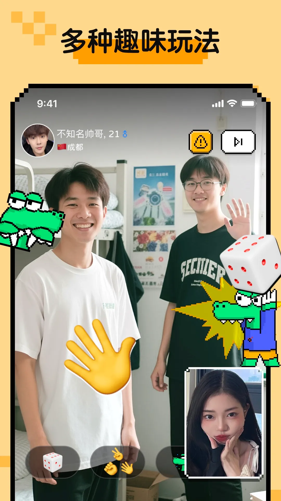 2. 真人视频连线,前后双摄设计,沉浸式互动,真实展现自我,杜绝照骗等问题。