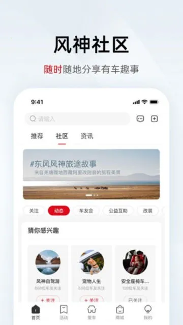 东风风神2026官方正版APP整合车辆信息推送、车主社群等服务。能掌握全系车款内容,有车可交流,没车可了解资料。还有经销商查询、预约试乘等功能,关联车辆可进行智能操作及查看养护记录等。