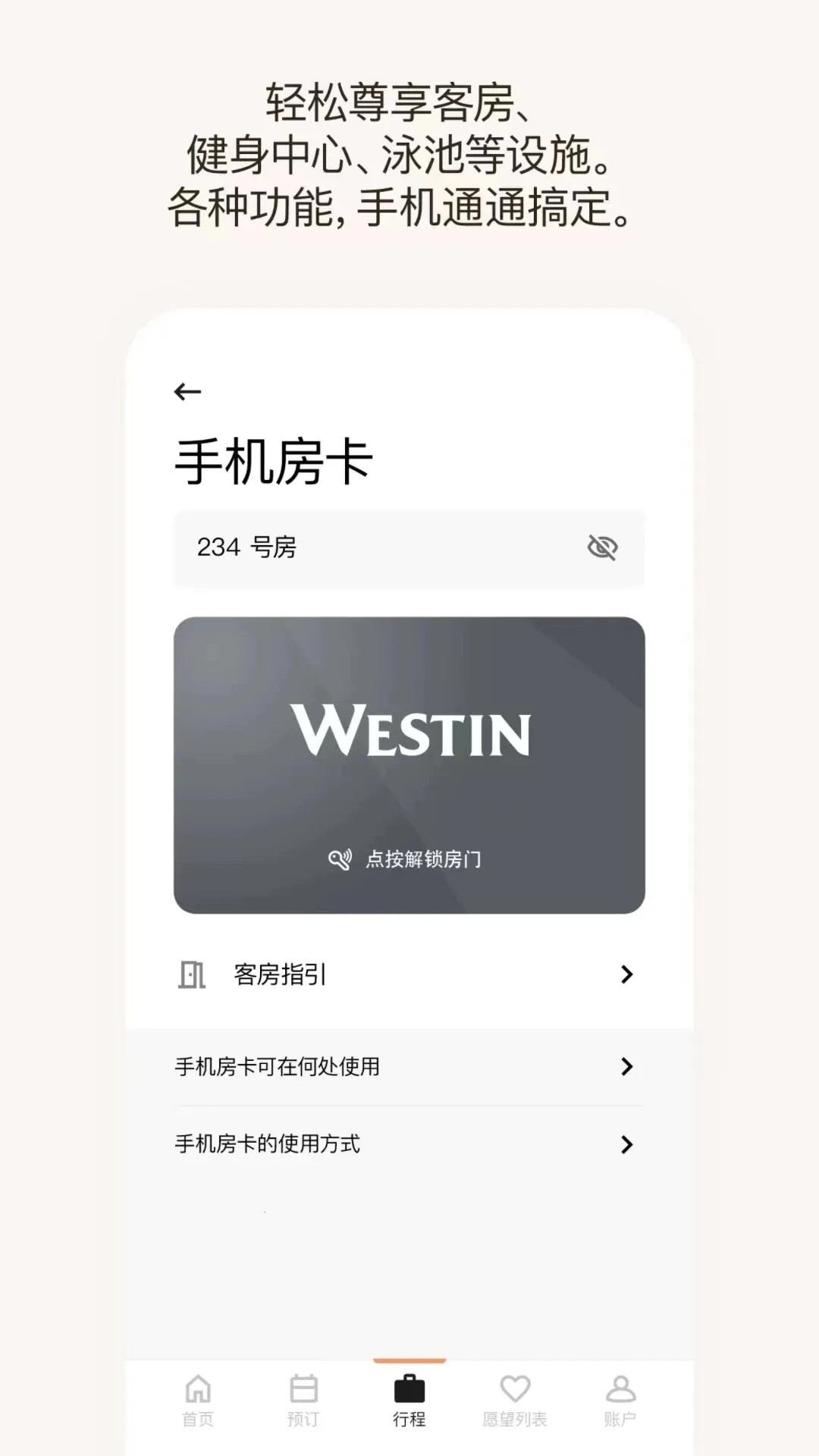 3. 住宿无比便利:提前48小时手机入住预登记,轻松退房,凭手机钥匙开门,享优先升级和延迟退房,随时联系酒店员工。
