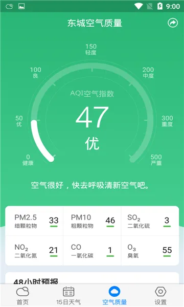 3. 贴心功能:首屏显示过去5天的天气预报,丢弃无效信息;提供空气质量查询功能,实时了解所在地空气质量,为健康出行提供参考。