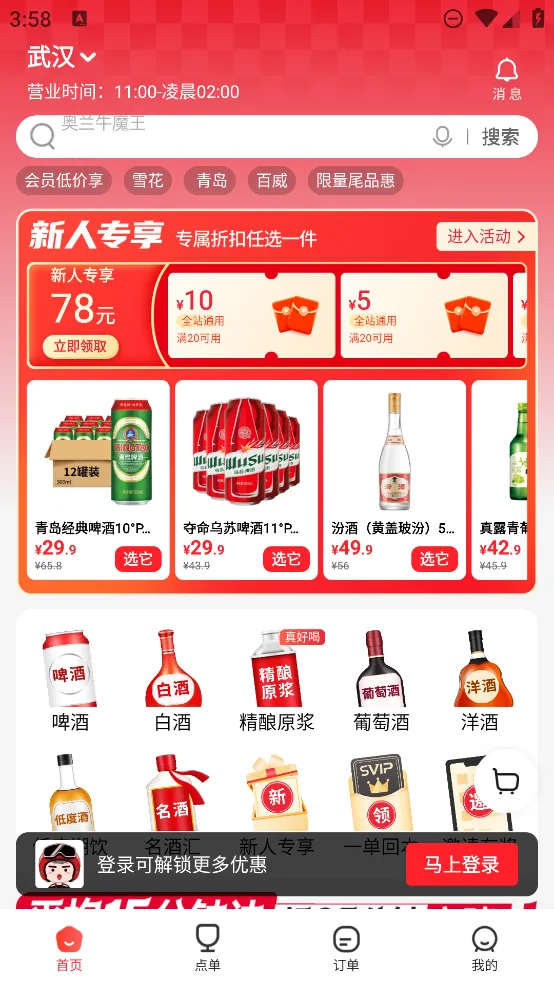 3. 酒水种类丰富,涵盖葡萄酒、国产啤酒、进口啤酒、洋酒、白酒等近千种商品,满足不同用户需求。