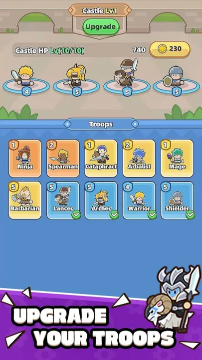1. 独特兵种解锁:游戏中可解锁10多种独特兵种,如坚韧的步兵、远程弓箭手、盾牌兵及传奇魔法骑士等。每种兵种都有独特技能和升级路径,能将普通小队打造成精锐部队,见证堡垒威力飙升,直面更强大敌人。