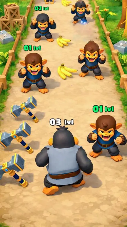 2. 独特进化系统:拥有有趣的进化系统,通过吃掉等级相同或更低的猿猴来成长,还能拾取强力道具如锤子摧毁障碍物,逐步变得更大更强,最终进化成终极大猩猩。