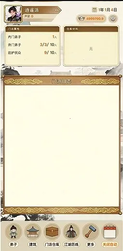 4. 派遣内门弟子外出闯荡,有机会获得丰厚奖励,采集矿石药材炼制丹药、锻造武器防具,强化弟子战力。江湖事件随机触发,每一次选择都影响门派声望与发展,书写属于自己的江湖传奇。