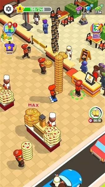 3、社交互动成就共享:支持绑定社交账号,一键分享经营成就、店铺规模、爆款披萨等高光时刻,邀请好友同台竞技、互相助力,还能与好友联动经营,交流经营技巧,携手打造顶流披萨商业帝国,增添社交趣味性。