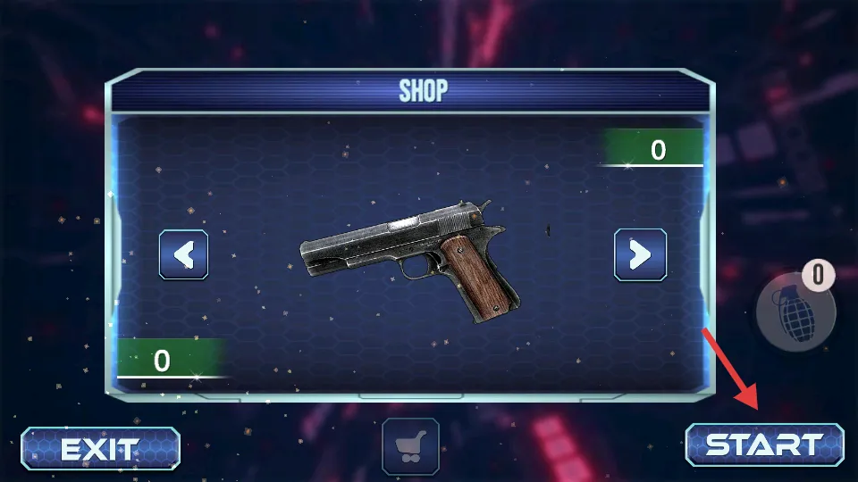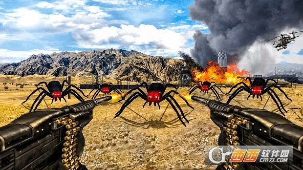1、玩家以第一视角在荒岛使用无限弹药武器射击四面八方的蜘蛛怪物。