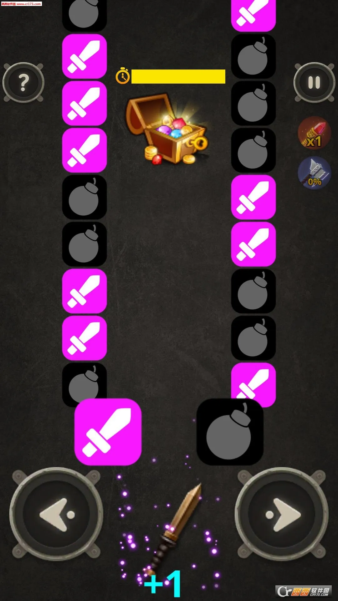 对于游戏的玩法,主要还是以点击为主,与传统的音块滑落的音舞游戏有些相似,通过点击带有“剑”以及其他颜色比较鲜艳的图标来增加COMBO,切记不要点击带有“地雷”标准的图形,否则会连击终止,而且还会减少你的时长。