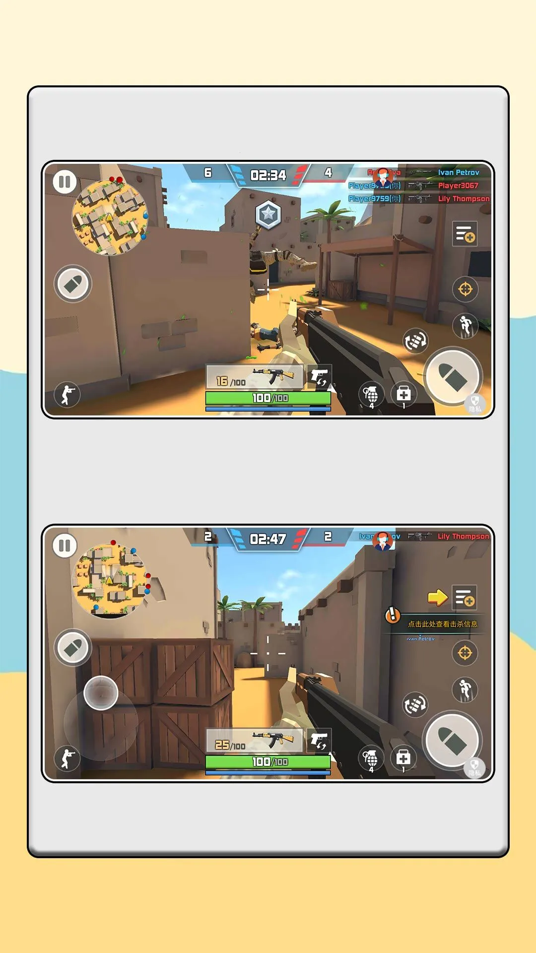 2、多样地图场景:包含屋顶激斗、沙漠城战、废弃工厂等多样地图场景,各地图地形与战术策略设计差异化显著,带来不同战斗体验。